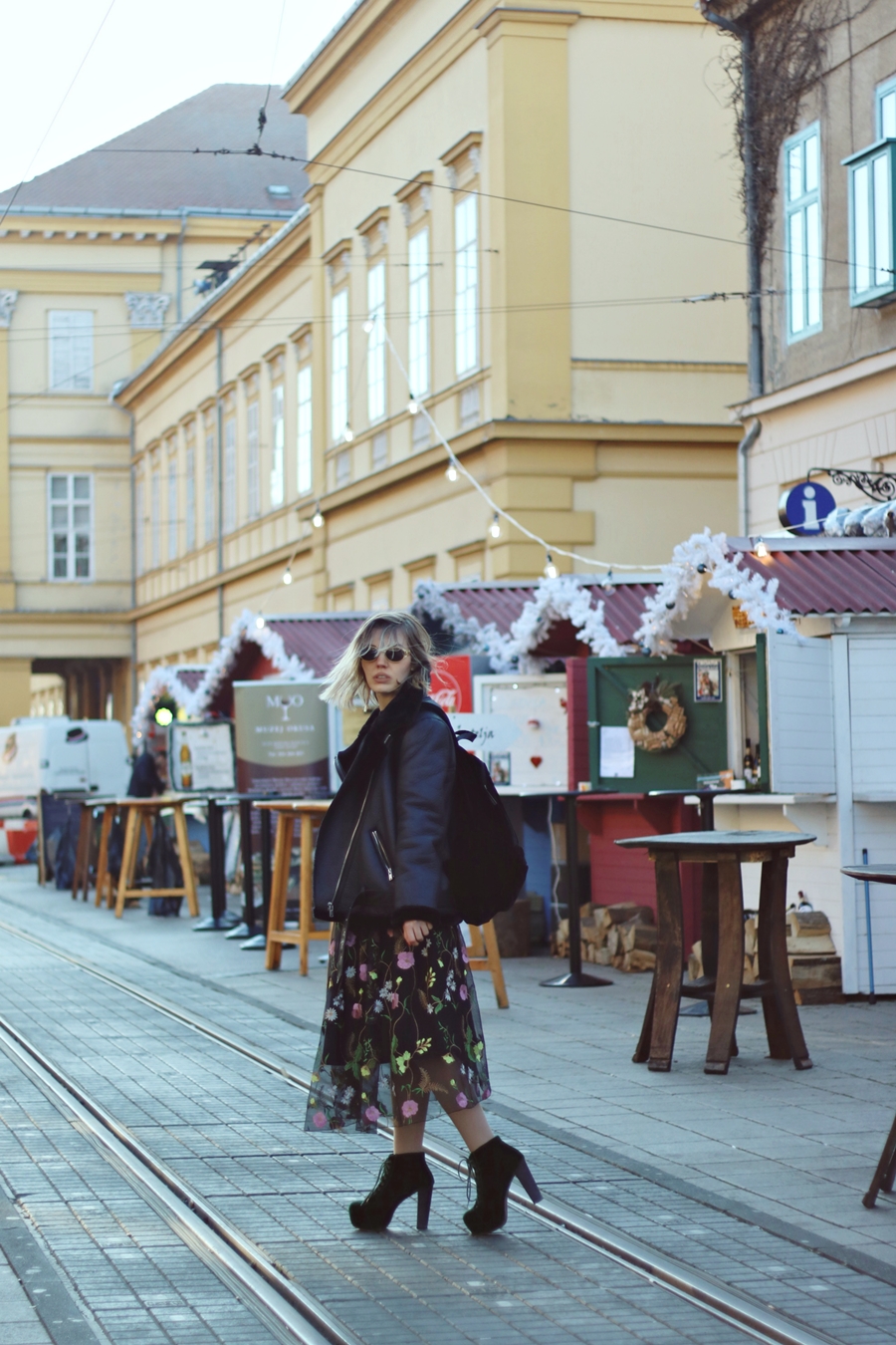 There is something in those flowy, mesh skirts - whenever I wear them, I feel so happy and get that amazing Carrie Bradshaw vibes. This skirt is full of embroidered flowers, it fits perfect with velvet green JF boots. To break that "girly" effect, I've picked Zara's massive biker jacket and Giant Vintage sunglasses.