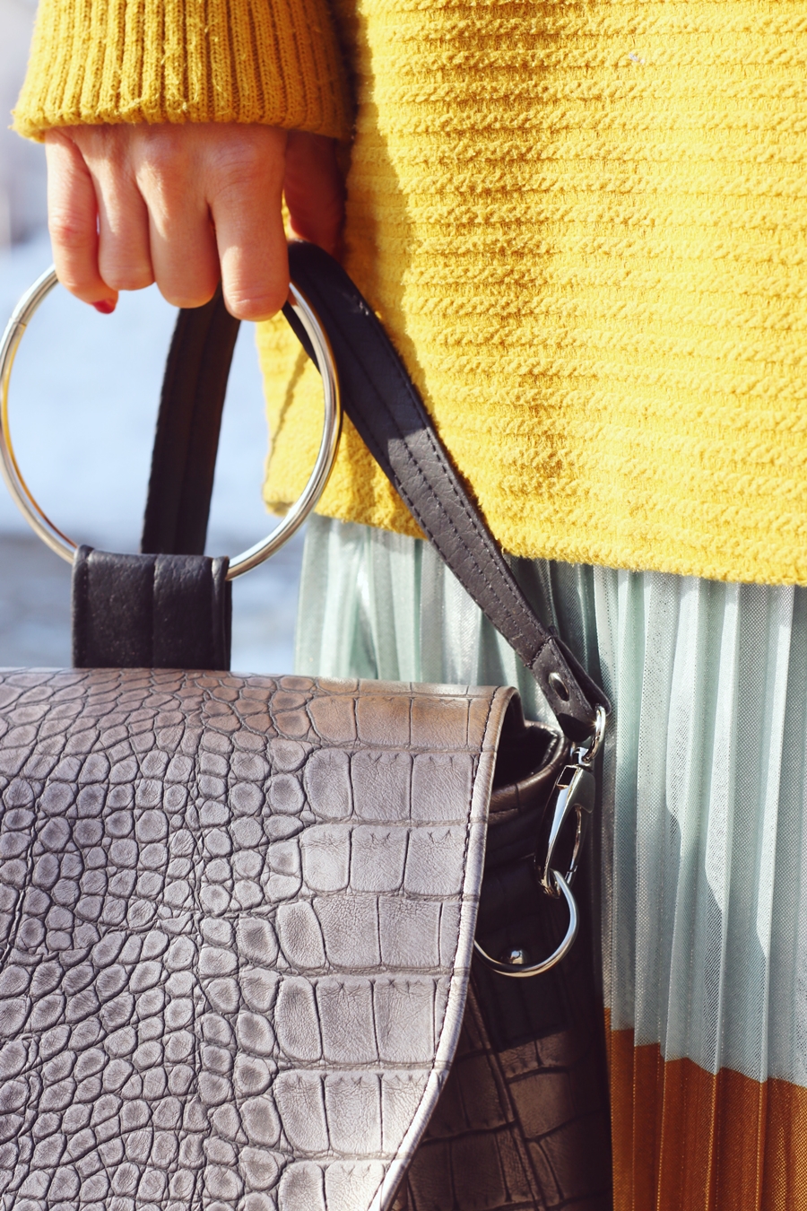I've got this yellow coat few years ago and it is still one of my fave coats. The day was sunny as were shades of the clothes I wore - shiny pleated dress in combination with oversize sweater and lovely Poppy backpack in beautiful bronze color that changes into bronze or gold as sun shines over it. I am so happy to have those unique piece of accessory. Wishing you all a great week!